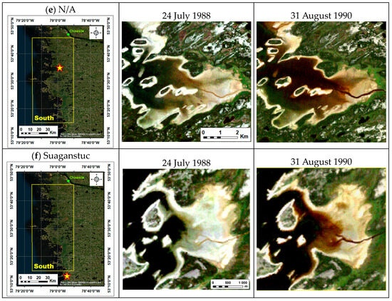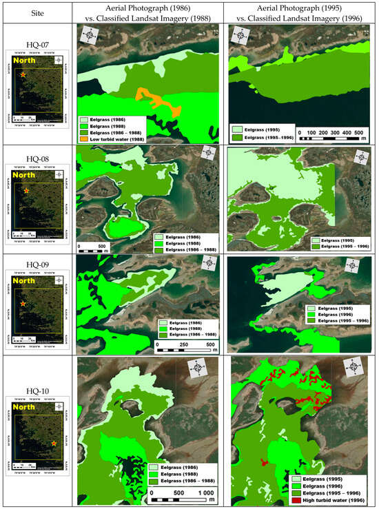 A comparison of the extent of eelgrass delineated from aerial photographs and Landsat classified images on specific sites (marked by a red star) over the study area. Aerial Photograph (1986) [23,59] vs. Classified Landsat Imagery (1988), Aerial Photograph (1995) [23,30] vs. Classified Landsat Imagery (1996).