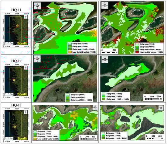 The second method validated the results at a finer resolution than at the bay scale by comparing the classified images with maps produced for seven sites selected from the studies carried out on behalf of HQ (Table 5). Since aerial photographs were unavailable for 1991, only the 1988 and 1996 classifications were compared at individual HQ sites where eelgrass beds were manually digitalised (Figure 9). There are some agreements concerning eelgrass presence between both types of maps in most sites, but the boundaries and extents are different. Generally, the edges of the eelgrass meadows did not perfectly match the classified images and the air photo interpretations, probably because of a difference in the scale of the original dataset (1:30,000 for the image versus 1:10,000 for aerial photographs). It should be noted that, on the 1988 classified image, eelgrass occupied more area in all sites and was found further offshore, compared to the areas mapped on the 1986 aerial photos. On the opposite, the eelgrass delineated on the 1996 classified image generally extends closer to the coast if we compare it with the limits of eelgrass on the aerial photos dating from 1995. Finally, on the 1996 classified image for several sites, i.e., HQ-08, HQ-09, HQ-12, and HQ-13, the extent detected from the Landsat imagery covers a much smaller area than that established from the 1995 aerial survey (Figure 9).