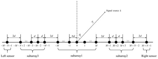 Assume there are K narrowband uncorrelated signals incident on the MSNA, which consists of sensors, as illustrated in Figure 1. The MSNA is composed of 3 subarrays and 2 additional sensor elements, with a minimum inter-sensor spacing of d, where d is a wavelength. Subarray 1 is comprised of sensors with a spacing of . Subarrays 2 and 3 are symmetrical to each other, each consisting of sensors with a spacing of d. They are spaced apart from subarray 1. Additionally, two extra sensors are positioned at both ends of the array, with the leftmost sensor spaced from subarray 3 and the rightmost sensor spaced from subarray 2. In this MSNA array, the sensor indices can be represented as . The sensor positions can be represented by the set .