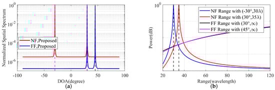 where represents the wavelength and and denote the angle and distance between the near-field source and the array, respectively. According to the definition of the Fresnel region, the signal is considered a near-field source when [11], where is the array aperture. If , indicating a far-field source, then , i.e., , and can be rewritten as: