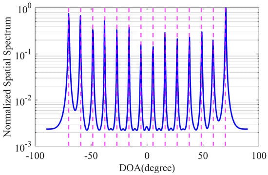 where and represents the peak value of the kth signal. To estimate the DOAs of all signals, it is necessary to remove the distance information from Equation (16) while retaining the angle information, i.e., removing and retaining . Therefore, setting , , Equation (16) can be further rewritten as: