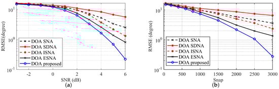 Figure 4. RMSE of DOA estimates versus SNR and snapshots. (a) RMSE versus SNR. (b) RMSE versus snapshot. - 2.