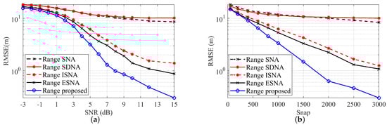 Figure 5. RMSE of range estimates versus SNR and snapshots. (a) RMSE versus SNR. (b) RMSE versus snapshot. - 2.