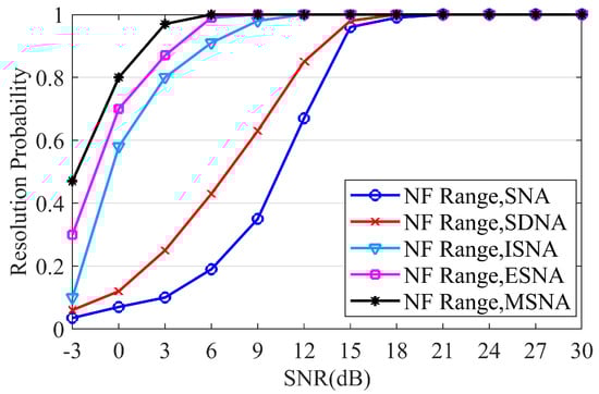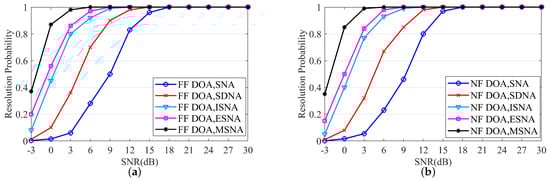 In the fifth set of experiments, we conducted a comparative analysis of the resolution performance probability of the proposed MSNA. The results are shown in Figure 6 and Figure 7. During the experiment, the number of snapshots was set to 1500, and the SNR ranged from [−3 dB, 30 dB]. In Figure 6, we compare the DOA estimation resolution performance for five different arrays structures. Figure 6a,b show the DOA estimation resolution for pure far-field sources and pure near-field sources, respectively. The parameters for the pure far-field sources were set to and , while the parameters for the pure near-field sources were set to and . In Figure 7, we compare the resolution performance of the range estimation for five different arrays. Since the range for far-field sources is infinite and cannot be used for resolution performance comparison, we selected a pure near-field scenario. The parameters for the two near-field sources were set to and . The experimental results indicate that the proposed MSNA exhibits superior resolution performance compared to other array structures under the same conditions. Specifically, at a low SNR, the DOA and range resolution capabilities of the MSNA outperformed those of other arrays.