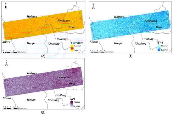 Spatial distribution of feature information: (a) elevation (m); (b) DP (mm); (c) slope (degree); (d) distance to river (m); (e) curvature; (f) TWI; (g) SPI.