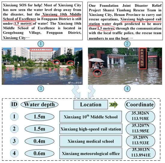 To effectively extract beneficial depth and location information from SMD, keyword matching, elimination of spam, and deduplication of the data were applied to the datasets of Xinxiang and Weihui. The postings (noiseless) related to water depth, i.e., keyword(s) containing “water depth” and “* meters”, and information on geographic names and water depth were removed. These steps were carried out with the “key word query and match” tools in Excel. The flooded depth and location information was checked by news broadcasts, reporter interviews, police rescues, etc. For instance, information on the Henan rainstorm is available from real-time field interviews by Beijing News reporters on the Tencent website. Real-time field rescue updates were also published by People’s Information. Verified information was gathered, as shown in Figure 3. The geographic names were transferred into latitude and longitude coordinates under the appropriate WGS1984 coordinate system utilizing the Baidu API and the coordinate system conversion principle. As shown in Figure 1, these points represent the locations where flooding occurred.