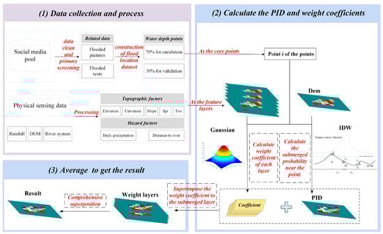 - The weight of each generated PID layer is determined by the value of the feature information layer pixel within a certain range around the inundation point location, where the value for the susceptibility to flooding is computed by the feature information using a normalization method, and for the final weight value, a smoother Gaussian surface-based weighting method is introduced.