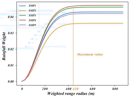 To determine the optimal value of , in this paper, the weight values of the corresponding weighting factors were calculated for the five SMP locations by setting up the radius of the region of interest from 1 cell to 30 cells (900 m). Figure 6 shows the calculation of the saturation value of at 25,000 m. With the increase in the region’s radius, the factor weighting value reached the saturation value at around 420 m (corresponding to the number of cells of 14). So, the region’s radius was set to be 420 m to calculate the factor weighting value around the SMP. Therefore, in this paper, = 25,000 and radius = 420 m were input into the function to calculate the weighted probability value.