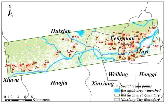 The river system in the study area, the National Aeronautics and Space Administration’s digital elevation model (DEM) and hour-by-hour observations from ground meteorological stations in China were used as the raw geographic information base data for the flood inundation analysis (Table 1). Data from Sina Weibo during the 2021 rainstorm event in Henan, China were used to extract the geographic names and water depths. Weibo posts and pictures from 00:00 on 17 July to 24:00 on 31 July in 2021 about the flooding in Henan were collected by combining Web Crawler technology and the Weibo Application Programming Interface (API). There were, in total, 63,986 texts and 1901 pictures about Xinxiang, and they were all used in this case study.