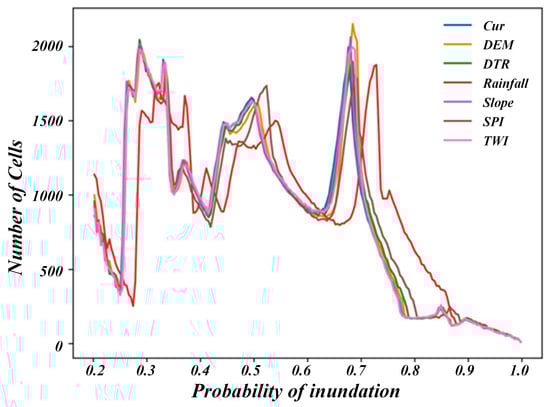 During the specified calculation period, i.e., 22–26 July 2021, the areas of Fengquan and Muye were identified as at high flooding risk. Figure 10 illustrates that these areas are significantly at risk, primarily due to their lower elevation and higher urbanization rate. High flooding probability areas are mainly clustered along the river, indicating that river areas are more susceptible to flooding. This finding is consistent with what is indicated in official reports about the distribution of flooded areas. Figure 9 shows that the probability–image curve for the rainfall factor is shifted to the right, indicating its higher weight. This confirms that rainfall was the main driver of the flood event. Additionally, the flow power index (SPI) also shows a rightward shift, indicating its influence on flooding. The combination of the high rainfall and the insufficient flood storage capacity of the river resulted in severe flooding.