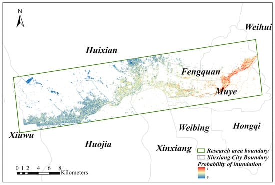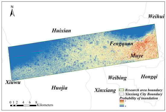 GF-3 image and threshold segmentation method were used to extract the flood range of the day. We used this range to clip the final flood probability distribution map and obtained the probability estimation results only in the flood range. This was helpful for the subsequent quantitative statistical verification of the range to evaluate the effectiveness of the method. As shown in Figure 11, the submerged area of the water body is still relatively large. According to the colors of the submerged areas shown in the legend, it was found that most of the probability estimates in this area were relatively large. The methodology of this study shows some applicability in most of the areas, and the corresponding degree of inundation risk is also reflected by the different colors.