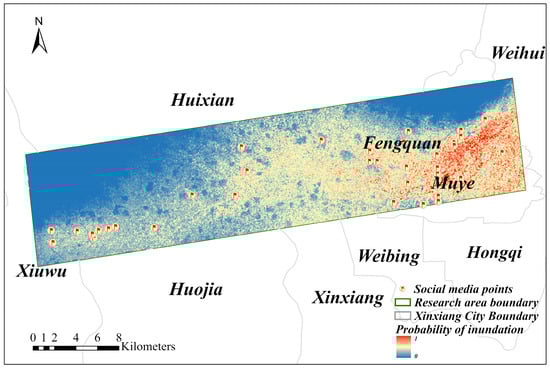 - Finally, the findings of the flood inundation probability distribution estimation for the entire map are validated by integrating the water bodies extracted from the post-event radar images and the social media points used for testing.