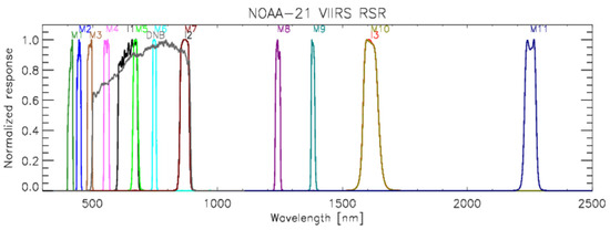 As a key Earth-observing instrument, VIIRS was integrated on the S-NPP, NOAA-20, and NOAA-21 satellites to produce Sensor Data Record (SDR) data for 27 Environment Data Records (EDRs) for the bio-geophysical parameters (as of 11 January 2023) [9]. Following a long heritage of legacy sensors, such as NASA’s Terra and Aqua Moderate-resolution Imaging Spectroradiometer (MODIS), and NOAA’s Advanced Very-High Resolution Radiometer (AVHRR), VIIRS was developed and designed to provide observations of the entire globe twice per day with moderate spatial resolutions and accurate on-orbit radiometric calibration capabilities from the on-board calibrators. VIIRS has 14 RSBs, 7 Thermal Emissive Bands (TEBs), and one Day Night Band (DNB). The Relative Spectral Response (RSR) functions as well as spatial and spectral characteristics of the NOAA-21 VIIRS RSBs are shown in Figure 1 and Table 1. The prelaunch measurements of the VIIRS spectral response functions were completed in 2019 using Spectral Measurement Assembly (SpMA) dual monochromators and NASA Goddard Space Flight Center’s (GSFC’s) Goddard Laser for an Absolute Measurement of Radiance (GLAMR) laser system [10]. There are spectral matching bands between Moderate (M) and Imaging (I) bands, such as I2/M7 and I3/M10, shown in Figure 1. The RSR and standard calibration parameters can be found at the NOAA Calibration Center (NCC) website at https://ncc.nesdis.noaa.gov/NOAA-21/index.php (accessed on 21 July 2024).