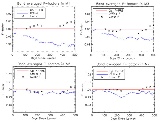 Figure 4 shows examples of comparisons between the normalized offline SD F-factors, lunar F-factors, and operational F-factors in the VISNIR bands. While the offline F factors are discussed later in Appendix A, the lunar F-factors show a stable response over the one-year operation. As a result, the static operational F-factors, the red lines in Figure 4, are valid considering the lunar F-factor trends.
