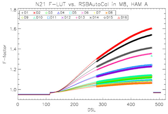 Following the opening of the cryo-radiator door on 8 February 2023 (DSL 90), the first MMOG took place at 23–25 February 2023 (DSL 105-107), in response to the LWIR band gain degradation along with the initial gain degradations observed in SWIR bands, particularly in band M8. Initially, the first MMOG appeared successful for about 20 days, after which gradual increases in the degradations of bands M8 and M9 were noted, starting from DSL 110. Offline F-factors, as shown in Figure 6, indicated an approximate 25% averaged increase in the F-factor in band M8. Specifically, detector 16 in band M8 experienced an F-factor increase of up to 60%, as demonstrated in Figure 7. Note that NOAA-21 VIIRS MWIRs also started to degrade again around the same time as the SWIRs, though the rate of MWIR degradation was smaller [44].
