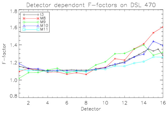 Figure 7 shows the band M8 operational calibration coefficients (or F-factors) that were used for the VIIRS SDR product. Band M8 detector F-factors showed the largest detector level deviations among the SWIR bands. The lines are from the manually delivered F-PREDICTED LUTs, whereas the symbols represent the RSBautoCal calculated calibration coefficients. The F-PREDICTED LUT was switched to RSBautoCal on 17 August 2023 and restored on 1 March 2024 as explained in Table 3. The detector dependencies for 5 VIIRS SWIR bands were characterized on DSL 470, as shown in Figure 8 (just before the second MMOG event). Large F-factor variations were observed for the near-the-edge detectors 16 (or 15) and the patterns were very consistent over the detector arrays for these SWIR bands. It should be noted that the 32 detectors of band I3 were mapped into 16 detectors in Figure 8 showing similar trends of detector degradation when compared to the M-bands. From this spatial pattern of degradations, it was inferred that more contaminants accumulated toward detector 16 compared to the other side of the detector arrays in the S/MWIR FPA.