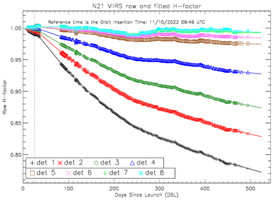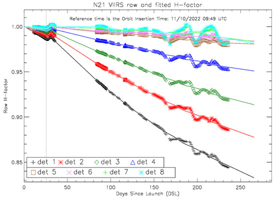 The NOAA-21 VIIRS raw and fitted H-factors (lines) using the updated τSDSM function (from yaw and on-orbit SDSM data until 23 April 2023).