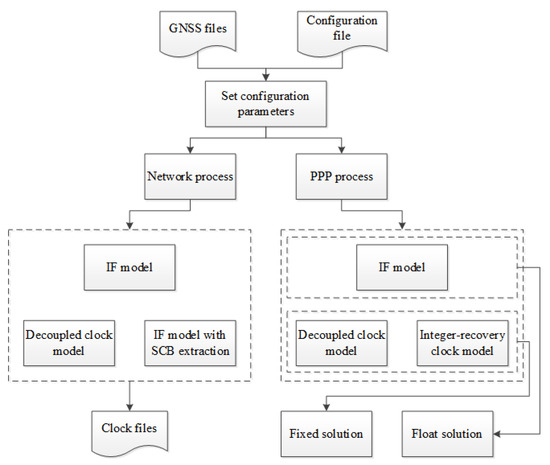 At present, the majority of open-source software is developed using integer-recovered clock (IRC) models or fractional cycle bias (FCB) models. Cube is the inaugural software based on the decoupled clock model that is capable of decoupled satellite clock estimation and implementing PPP-AR based on the estimated product. Cube is a secondary development based on RTKLIB (version 2.4.3 b34) and mainly composed of two modules, satellite clock/decoupled clock estimation and PPP/PPP-AR. At present, only GPS observations can be processed, and we only experimented with Cube on a Windows system. However, Cube benefits from the C language and is easy to port to other operating systems, such as Linux. At the server end, Cube can estimate International GNSS Service (IGS) legacy clocks, clocks with satellite code bias (SCB) extraction [32], and decoupled clocks using undifferenced observations. Additionally, PPP-AR based on the DCK model and the IRC model can be implemented at the user end [33]. Importantly, all significant files are output in the form of formatted text, which is highly beneficial for the analysis and application of experimental results.