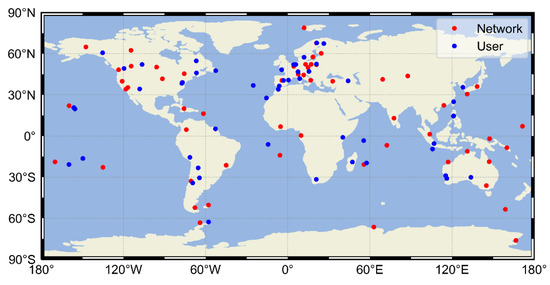 Station distribution. The stations in red (labeled as Network) were utilized for clock estimation at the server end, and the stations in blue (labeled as User) were used for the positioning experiment at the user end.