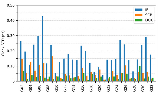 Since the clock products solved by the three models have different bias terms, we only evaluated their accuracy by using the standard deviation (STD), as shown in Figure 4. The figure demonstrates that the STDs of the clock products solved based on the IF model are significantly higher than those of the other models. The clock estimated based on the DCK model has the smallest STD, which means that it has the highest stability. Although extracting satellite code bias can increase the stability of the satellite clock, it still cannot achieve the accuracy of decoupled carrier-phase clocks that are completely unaffected by code bias in the DCK model.