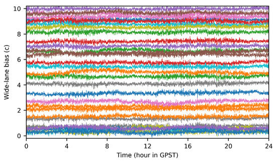 The time series of wide-lane ambiguity biases on DOY 038 in 2021 are shown in Figure 6. To facilitate observation, each time series is translated into the range of 0 to 10 cycles. From the figure, it is clear that the wide-lane ambiguity bias of all satellites shows a high degree of stability over the day.