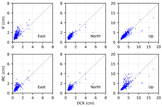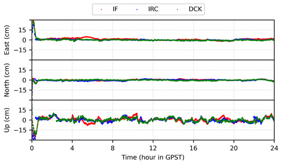 In order to provide a comprehensive comparison of the positioning performance of the three types of models, we conducted a week-long comparison of the results, as shown in Figure 10. Each point represents a station in the figure. Compared with the IF model, the DCK model has higher positioning accuracy, especially in the easterly direction. Moreover, the positioning accuracy based on the DCK model is slightly higher than that of the IRC model due to the consistent processing strategies of the server end and the user end, which is also reflected in the ambiguity fixing rate in Table 2.