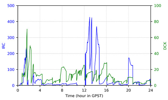 Figure 9 shows the ratio-test results of the IRC and DCK experiments based on Cube at station AREQ on DOY 039 in 2021. Clearly, the ratio-test value of the IRC model for station AREQ is significantly higher than that of the DCK model for the ambiguity-fixed solution. This suggests that the ambiguity-fixed solution of the IRC model is highly reliable. It also indicates that the DCK model has a greater difficulty in determining the optimal integer ambiguity, and therefore a more stringent AR method should be used to assist in calculations. Additionally, the figure shows that around 1 h, the IRC model achieves a fixed solution before the DCK model. This can be attributed to the fact that the IRC model defines the wide-lane ambiguity bias as a constant throughout the day, while the DCK model considers the possibility of this bias changing and defines it as a time-varying parameter. As a result, the wide-lane ambiguity takes longer to be fixed in the DCK model, and the superiority of the optimal solution over the suboptimal solution is diminished.