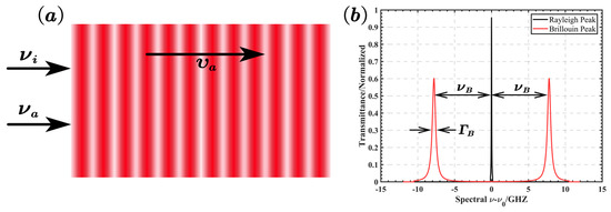 (a) Schematic of Brillouin scattering principle; (b) schematic of Brillouin scattering spectrum in water.