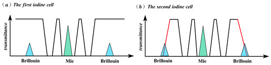 The principle of the dual-iodine-cell temperature measurement mechanism is shown in Figure 3. Two iodine cells of different temperatures and sizes are applied sequentially. Changes in the temperature and size of the iodine cells affect the absorption curve, as shown in Figure 3.