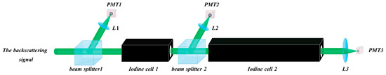 The backscattering signal is first split into two beams by beam splitter 1, and one small part of the light beam is converged directly on the PMT1 through lens L1. This channel is called the summation channel, which contains both the elastic scattering and inelastic scattering information. This channel can indicate the whole intensity of the received backscattering light. The other part is the major part of the received backscattering light. This part passes through the first iodine cell and then through beam splitter 2. Similar to beam splitter 1, the small part is received by the PMT2 through focusing lens L2, while the major part passes through the second iodine cell and is received by PMT3 through focusing lens L3.