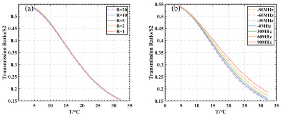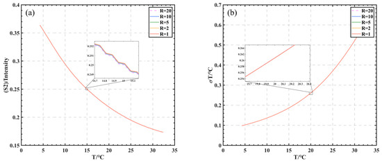 The ratio R of the elastic to Brillouin scattering energy in the seawater echo scattering spectrum affects the S2–temperature curve, where the stronger the elastic scattering energy, the more energy remains after being absorbed by iodine cell 1, resulting in an error. As shown in Figure 6a, the S2–temperature curves were obtained for different R values. The results show that different ratios of the relative energies of elastic and inelastic scattering had a small effect on S2 as the elastic scattering was thoroughly absorbed in the first iodine cell.