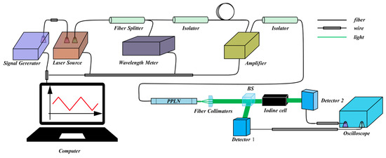 A tunable laser was needed to measure the iodine absorption spectrum. The wavelength was tuned by modulating with a signal generator. The laser source was approximately 1064 nm. The laser is continuous with a linewidth of 0.6 MHz. The frequency stability is less than 1 MHz (8 h, lab environment). The laser was divided into two parts via a fiber isolator. The weak part was detected with the wavelength meter, which was connected to a computer for the real-time monitoring of the output laser wavelength. The other strong part was amplified via an amplifier, and an isolator was used to protect the laser and amplifier. The amplified laser light was input into the PPLN for frequency doubling. The frequency doubling efficiency is related to the temperature of the PPLN. After the PPLN module, the double-frequency laser at around 532.10495 nm was transmitted into the free space via a fiber collimator. This light is indicated as a green bold line in Figure 7 and was divided into two parts via a 1:1 beam splitter. One part was detected with detector 1, and the other part passed through the iodine cell and was then detected with detector 2. The detector used was a Thorlab PDA36A2 silicon photodetector made in USA with a gain range of 0–70 dB in 10 dB steps. The signal acquisition oscilloscope had 12-bit quantization and a minimum bandwidth of 20 MHz. The outputs of the detectors were sampled with an oscilloscope.