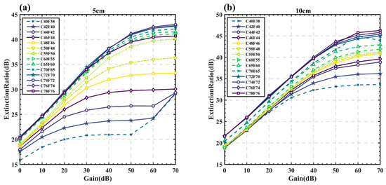 The relationship between the iodine cell extinction ratio and detector gain under various temperatures with a laser wavelength of 532.10495 nm: (a) 5 cm iodine pool; (b) 10 cm iodine pool. C and F represent the temperatures of the iodine bubble and the iodine tip, respectively (unit: degrees Celsius).