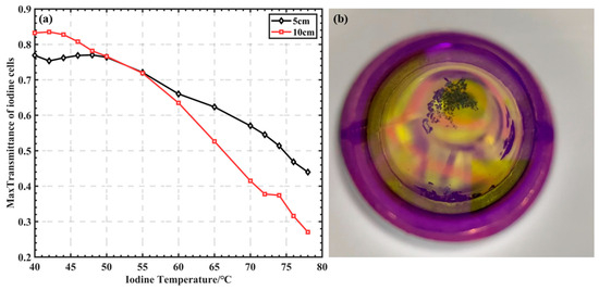 (a) Maximum transmittance of iodine cells at different temperatures. (b) Iodine vapor condensation on the window.