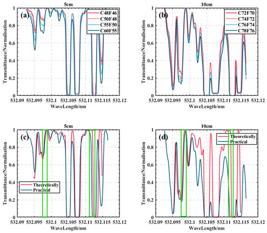 (a) Measured 5 cm iodine cell spectra at different temperatures; (b) measured 10 cm iodine cell spectra at different temperatures; (c) measured and theoretical absorption spectra of 5 cm iodine cells; (d) measured and theoretical absorption spectra of 10 cm iodine cells.