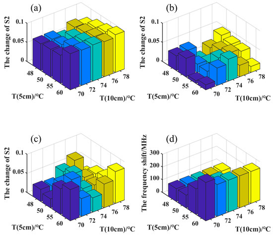 In Figure 12, the X-axis is the temperature of the 5 cm iodine cell, the Y-axis is the temperature of the 10 cm iodine cell, and the Z-axis is the amount of change in S2. The larger the value, the better the effect of the temperature measurement. Figure 12a–c correspond to different seawater temperature ranges. The temperature range of [5 °C, 15 °C] produced a better measurement effect than [15 °C, 32 °C]. The optimal temperature combinations of the iodine pools for different temperature ranges were obtained from the graphs as shown in Table 4.