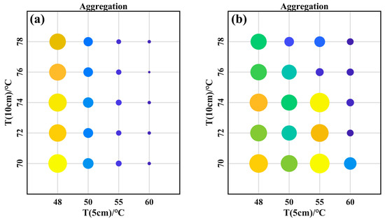 Figure 16 illustrates that the horizontal and vertical coordinates represent the temperatures of the first and second iodine pools, respectively, and the corresponding scattering point sizes correspond to the numerical magnitudes of . The aggregation significantly increased as the temperature of the 5 cm iodine cell increased due to an increase in the iodine pool absorption ability. This led to a larger extinction ratio for elastic scattering. The temperature of the second iodine cell had little effect on the aggregation because this aggregation was directly related to the first iodine cell.