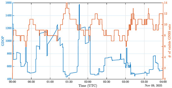 The typical atmospheric delays considered in GNSS navigation, being the tropospheric and ionospheric delays, and represented by in Equation (3) become less of a concern as most of the GNSS signals received at lunar altitudes did not propagate through these layers. This is due to the GNSS constellations’ altitude being significantly higher than the upper limit of the Earth’s ionosphere combined with the fact that the lunar GNSS users are located even higher than the GNSS constellations themselves. As a consequence, a GNSS user located in space and above the GNSS constellations typically receives GNSS signals transmitted by satellites on the other side of the Earth relative to the user’s location as well as from the side. However, it will not be able to track signals from the closest transmitting satellites, as GNSS antenna patterns are pointing toward the center of the Earth. This becomes obvious when looking at Figure 2, where the ionosphere and its upper limit are depicted in orange. This has already been thoroughly analyzed and discussed in [42], which analyzes the off-boresight angles histogram of the Galileo and GPS signals which are actually tracked by a GNSS receiver simulated in the lunar Gateway orbit. It shows that over a one-week simulated period of a GNSS receiver in lunar orbit, more than of the signals tracked by this lunar receiver originate from the side lobes of the transmitting satellites’ antenna. Concerning the main lobe, over the ° of angle aperture not covered by the Earth’s body, only 2° are covered by the ionosphere, as depicted in Figure 2. A mask can hence be applied to discard the few satellites of which the signals actually crossed the ionosphere by setting a conservative upper ionosphere’s limit such as 1000 km as considered in [56]. They will, therefore, be omitted in the following analyses.