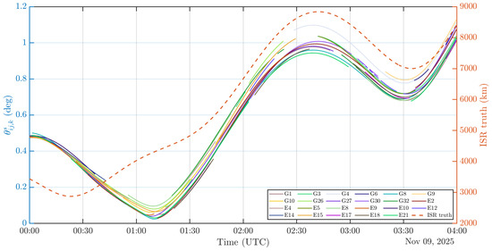 As mentioned above, the closer the parallelism assumption is to reality, the better the performances of the ISR estimator in terms of bias. This statement is true not only for the bias introduced by Equation (13) but also for the residual GNSS satellites orbital errors. Indeed, the capacity of the differential GNSS algorithms to cancel orbital errors depends on the angle between the steering vectors from the two users to a given GNSS satellite. Given the large orders of magnitude for a lunar differential GNSS scenario using Earth GNSS signals, it is of interest to understand how well the application of DGNSS for lunar orbiters can remove orbital errors. To this end, the angles as depicted in Figure 1b will be displayed over time as well as the residual on the orbital errors after application of single differencing on the pseudorange observables. Its value is computed according to: