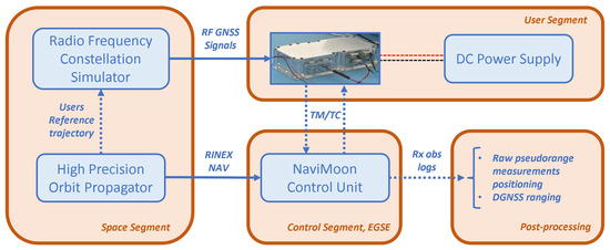 The overall scenario is depicted in Figure 3. This scenario is a potential real scenario as these two missions will both have a GNSS receiver aboard and a communication link to communicate with neighboring space missions. This scenario is simulated on 09-Nov-2025 00:00:00.000 Coordinated Universal Time (UTC) when the presence in space of both user missions can be assumed. The VMMO and Pathfinder were chosen as potential users for three reasons. The first is related to the certitude that they will both fly soon into space, with a planned date in 2025 [6,67]. The second is that Lunar Pathfinder will be one of the two very first missions ever to fly a Galileo-GPS receiver onboard all the way to the Moon, and will return GNSS Doppler, Pseudoranges, and Carrier Phase measurements as well as signal samples back to the ground. Finally, the CubeSat was an ideal candidate for presenting this concept given its low-cost constraint that justifies a potential need for low-complexity ranging techniques.