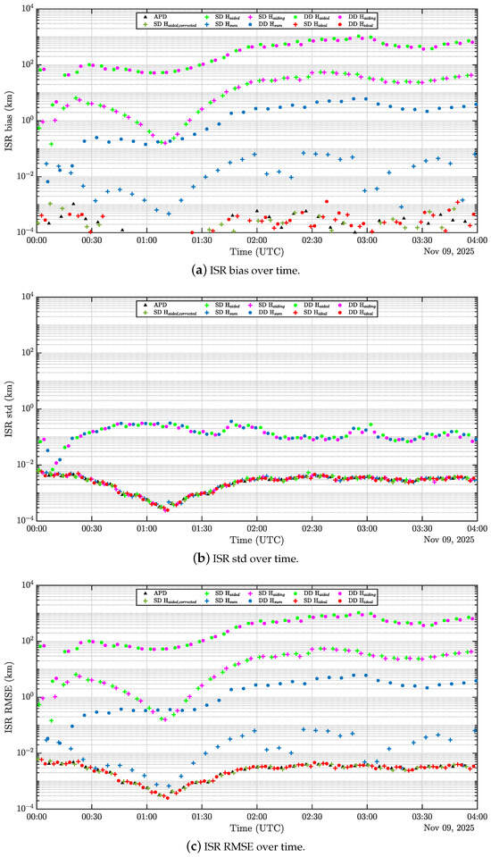 In Section 2.1.2, the observables alignment technique was presented assuming that the receiver timestamps after clock bias correction, and , are perfectly known. However, in real GNSS scenarios, is estimated based on the prior estimation of the receiver clock bias . The quality of these estimates hence depends on the satellite visibility and the GDOP [14,49,50,59]. And as already shown in [42], in lunar GNSS scenarios, the visibility of the satellites is low and the DOP values are high. As a consequence, in a lunar DGNSS scenario, the inter-user measurements time-offset estimates might be affected by significant residual errors. Given the high user velocities characteristic of lunar orbiters, a small error in timestamp offset estimation can result in a large error in ISR estimation as the pseudoranges of the aiding user would be interpolated at a slightly erroneous point in time, using Equation (4). Additionally, as space GNSS users are characterized by larger Doppler shifts when compared to terrestrial users, a small estimation residual error left on would result in a larger time-compensation error when compared to a terrestrial scenario.