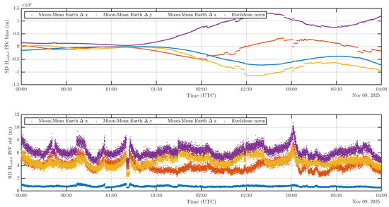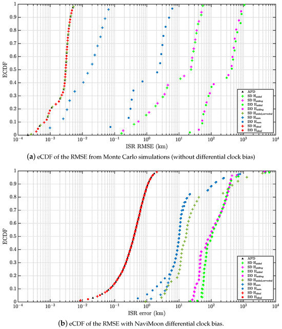 For a GNSS receiver in lunar orbit, the of the signals tracked are low and highly variable [41]. This implies a reduced capacity of the receiver to demodulate the navigation message as demonstrated in [42], which shows a significant reduction in the visibility of a GNSS receiver in lunar orbit when the navigation message can not be demodulated versus when it can be. More specifically, the analyses performed in [42] showed that the GPS L1 signal ephemerides can be demodulated for only 5 to of the time over the one-week simulated period of a GNSS receiver in lunar orbit. Hence, given the potential capacity overload of the ground network of deep space antennas, the receiver must be capable of using ephemerides demodulated in the past, i.e., with an older age of data. As a consequence, this might increase the GNSS satellite orbit residual errors significantly with respect to terrestrial applications. These are characterized by SISE that is defined as the difference of the satellite position and time as broadcast by the navigation message and the true satellite position and time, projected on the user-satellite direction [57]. In Equation (3), they are hidden in the unmodeled errors term . They remain under 1 m for ground applications as stated in [49]. In [57], the characterization of the SISE was performed for GPS over 4 years in the nominal range of the navigation message age of data (<3 h). However, outside of this nominal range, as explained in [58], the globally averaged SISE orbit degrades gracefully over time and is specified to remain below a 95th-percentile value of 388 m throughout a two-week period. Therefore, as a worst-case scenario, satellite orbital errors with a norm of 400 m of which the direction is randomly generated and follows a normal distribution are considered in this contribution. The objective of considering this worst-case scenario is to assess the potential of DGNSS techniques to cancel the effect of GNSS orbital errors despite the large ISR values, resulting in the decorrelation of the Signal In Space Ranging Error between the two users.