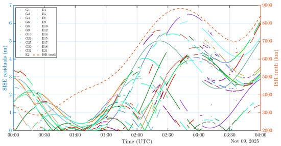 where is the range between receiver i and satellite s, is the range offset caused by the receiver’s local clock bias to the system time, is the modeled part of the satellite clock offset with the system time, which includes the correction calculated using the values broadcast in the navigation messages (for SPP) as well as a small relativistic correction caused by the orbital eccentricity and are the atmospheric delays, standing both for tropospheric and ionospheric delays. Finally, represents the unmodeled errors including receiver noise, multipath signals, orbital errors and other effects [50].