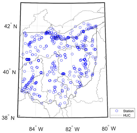 Geographic information of the study area. The blue dots represent the ground-based stations utilized in this study, and the dotted line delineates the boundary of the Hydrologic Unit Code (HUC)-4.