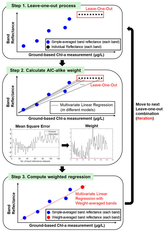 Then, the remaining n-1 combinations of surface reflectance for each band will be averaged, and in turn, we obtain n-1 combinations of simple-averaged surface reflectance for each band and the corresponding Chl-a measurement, which will be used as predictor and independent variables, respectively. For the leftover combination of surface reflectance, we also use m individual band reflectance from each band (before averaging) and the corresponding ground-based Chl-a measurement. This allows us to develop m different multivariate linear regression models and calculate the mean square error (MSE) based on different regression models. Subsequently, AIC-like weight is calculated by considering the MSE of different regression models following Equation (1):