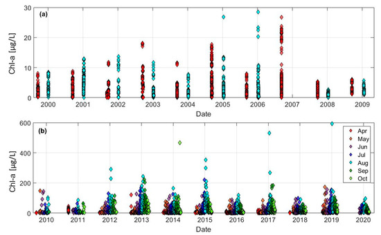 Temporal variation in chlorophyll-a concentration over Lake Erie (a) from 2000 to 2009 and (b) 2010 to 2020.