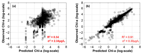 Scatterplot of Chl-a estimates from (a) multivariate regression and (b) AIC-like weighted regression.