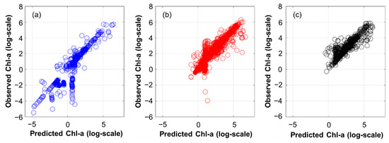 Seasonal scatterplot of observed and predicted Chl-a during (a) spring, (b) summer, and (c) autumn.