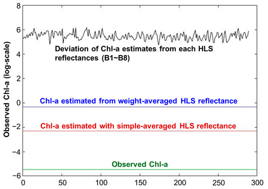 Figure 6 represents the scatterplot of observed versus estimated Chl-a from AIC-like weighted regression for spring (March to May), summer (June to August), and autumn (September to November). The R2 values ranged from 0.89 to 0.93, indicating that the estimated Chl-a showed good consistency with the observed Chl-a across all seasons. In terms of bias and RMSE, summer had the lowest bias (0.06 µg/L) and RMSE (0.55 µg/L), followed by autumn (bias: 0.20 µg/L, RMSE: 0.89 µg/L) and spring (bias: −0.39 µg/L, RMSE: 1.08 µg/L). One of the main reasons for the relatively poorer statistical performance during spring is the presence of a strong vertical line in Figure 6a, along with a scattered pattern at relatively low Chl-a concentrations. Similar findings have been reported by Seegers et al. [52] and Neil et al. [53], indicating that Chl-a estimated via satellite-based band reflectance exhibited lower statistical performance in the low Chl-a concentration range. Figure 7 depicts a typical example of the Chl-a estimation process by an AIC-like weighted scheme over the spring period. Specifically, Chl-a estimates from each HLS reflectance (before averaging each band spectrum) yielded a large deviation from the observed Chl-a. This phenomenon occurred due to the small magnitude (ranging from 1.9 × 10−6 to 8.7 × 10−6) and variation in reflectance (ranging from 10−6 to 10−5) within spatio-temporal windows. These band reflectances are used as independent variables for the simple linear equation developed with the n-1 combination of matchup pairs, which creates a large deviation from the Chl-a observation. In the case of Chl-a estimates with simple-averaged reflectance, it yielded relatively less deviation with the measurement than weight-averaged HLS reflectance. Consequently, even though AIC-based weights are continuously updated during iterations, they may not be updated significantly if the band reflectance does not vary. The main reason for the small magnitude and variation is related to the different characteristics of satellite-based reflectance depending on the water body condition. In general, scattering in water is caused by pigments and other impurities, contributing to the overall reflectance. Conversely, clean water yields a low signal-to-noise ratio across the visible and near-infrared spectrum as it acts as an absorber [54]. In addition, Timmons [55] revealed that inland lakes over Ohio during spring are under well-mixed conditions due to the spring turnover, leading to homogeneous water conditions and small magnitude and variation in satellite-based reflectance.