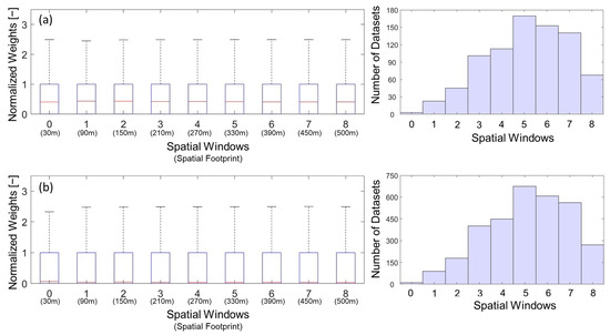 Boxplot of weight depending on different spatial windows along with number of datasets used for (a) Lake Erie and (b) other inland lakes across Ohio.